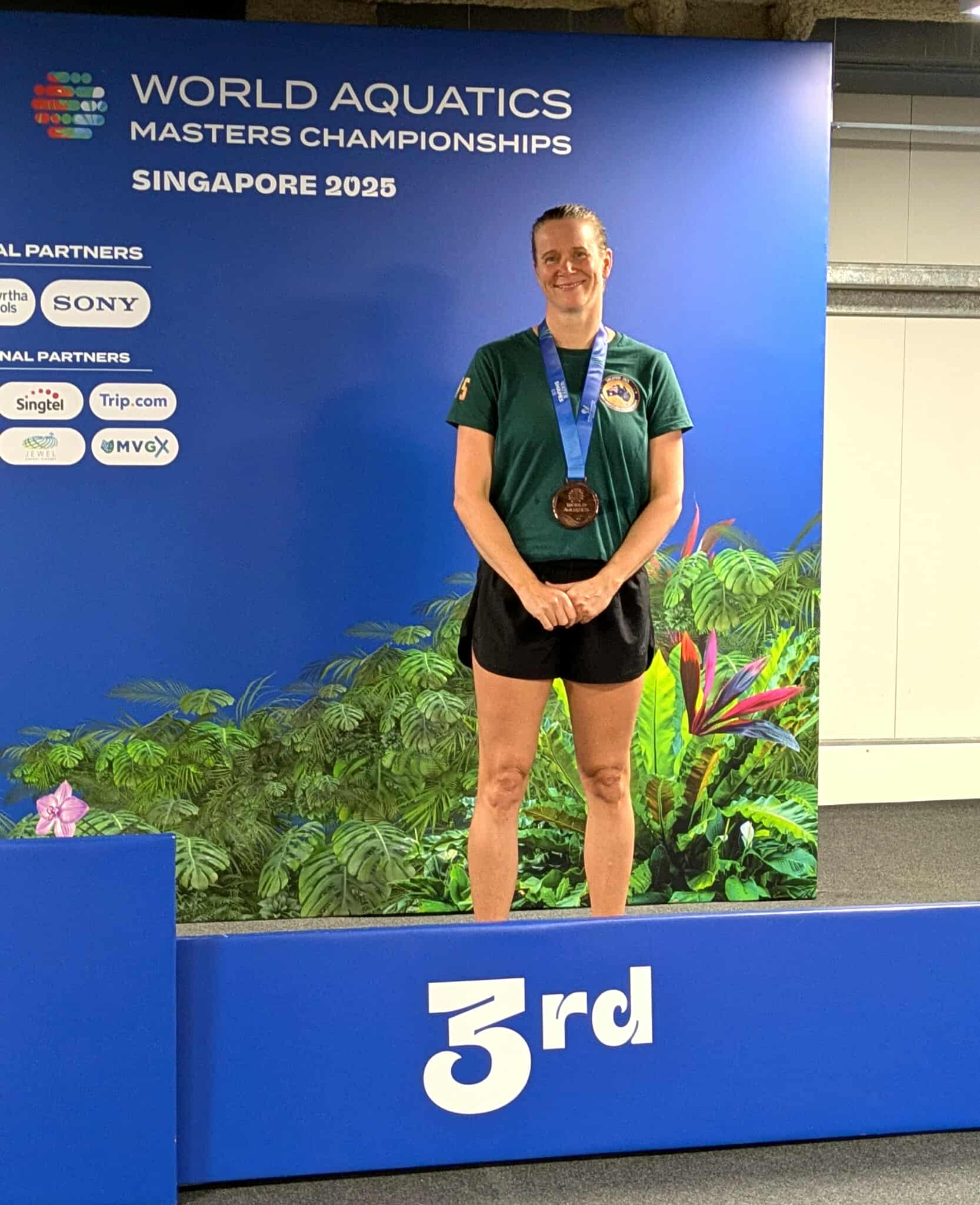 Lene winning a Bronze medal in the 50m Butterfly at the 2025 World Aquatics Masters Championships in Singapore.